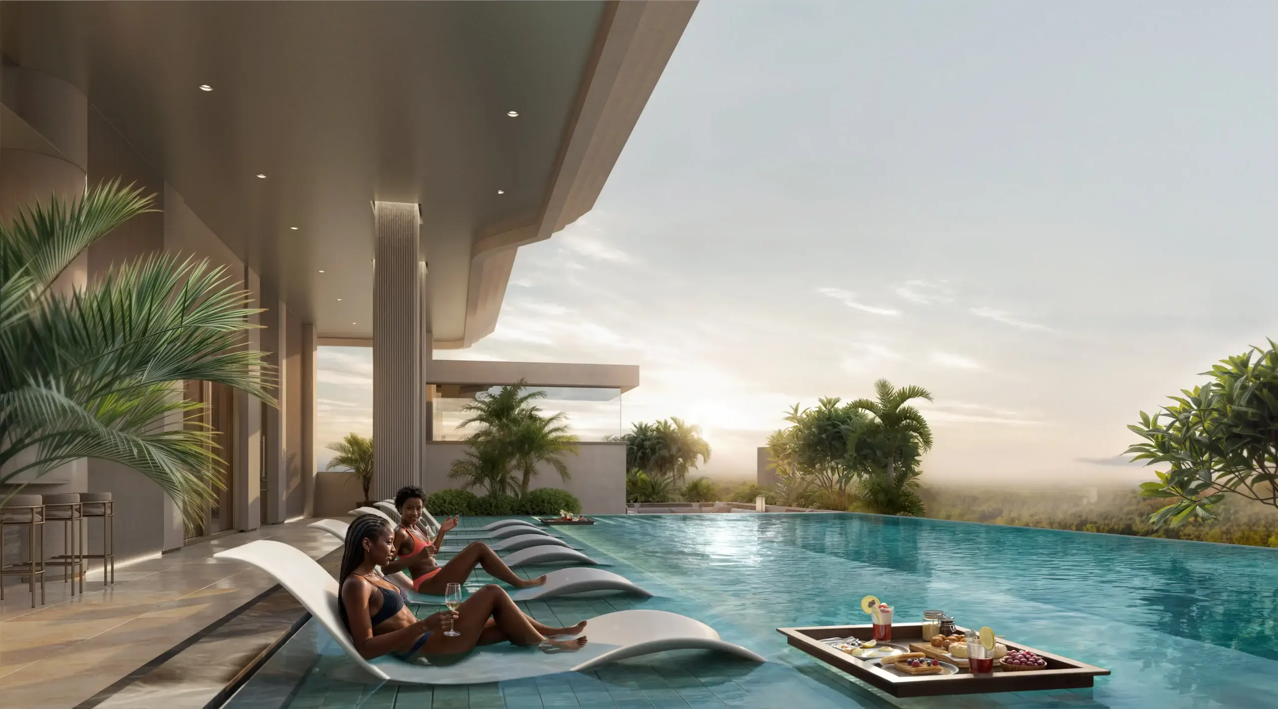 Heated rooftop infinity pool overlooking Karura Forest and the city skyline.